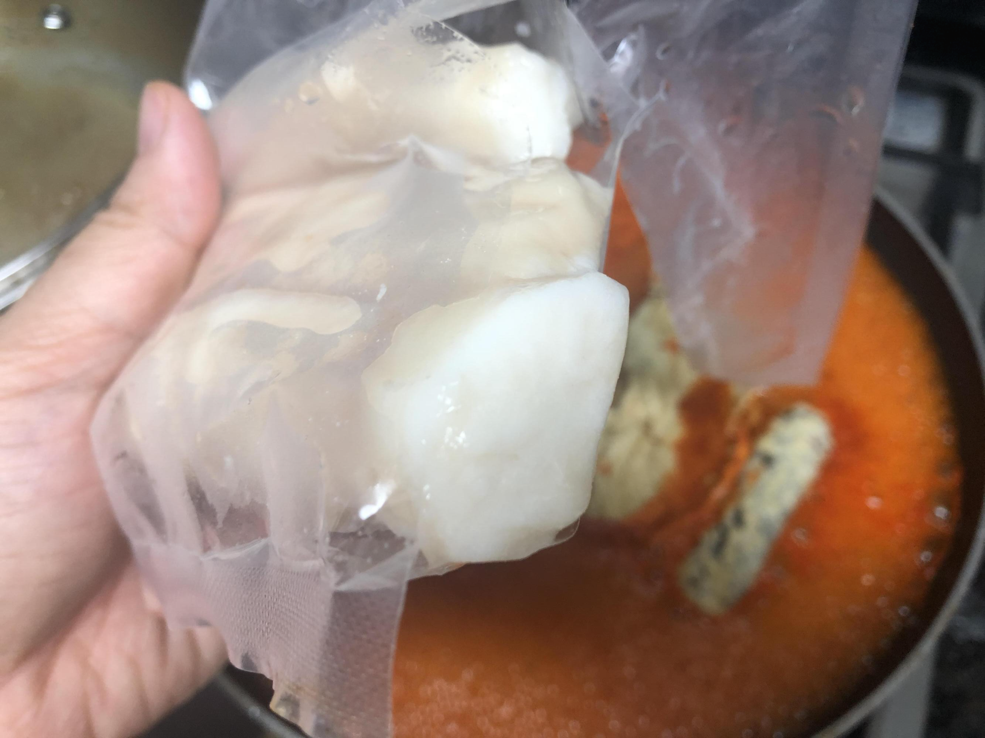 해동하기 귀찮으면 그냥 살얼음 상태에서 냄비에 넣어버린다!