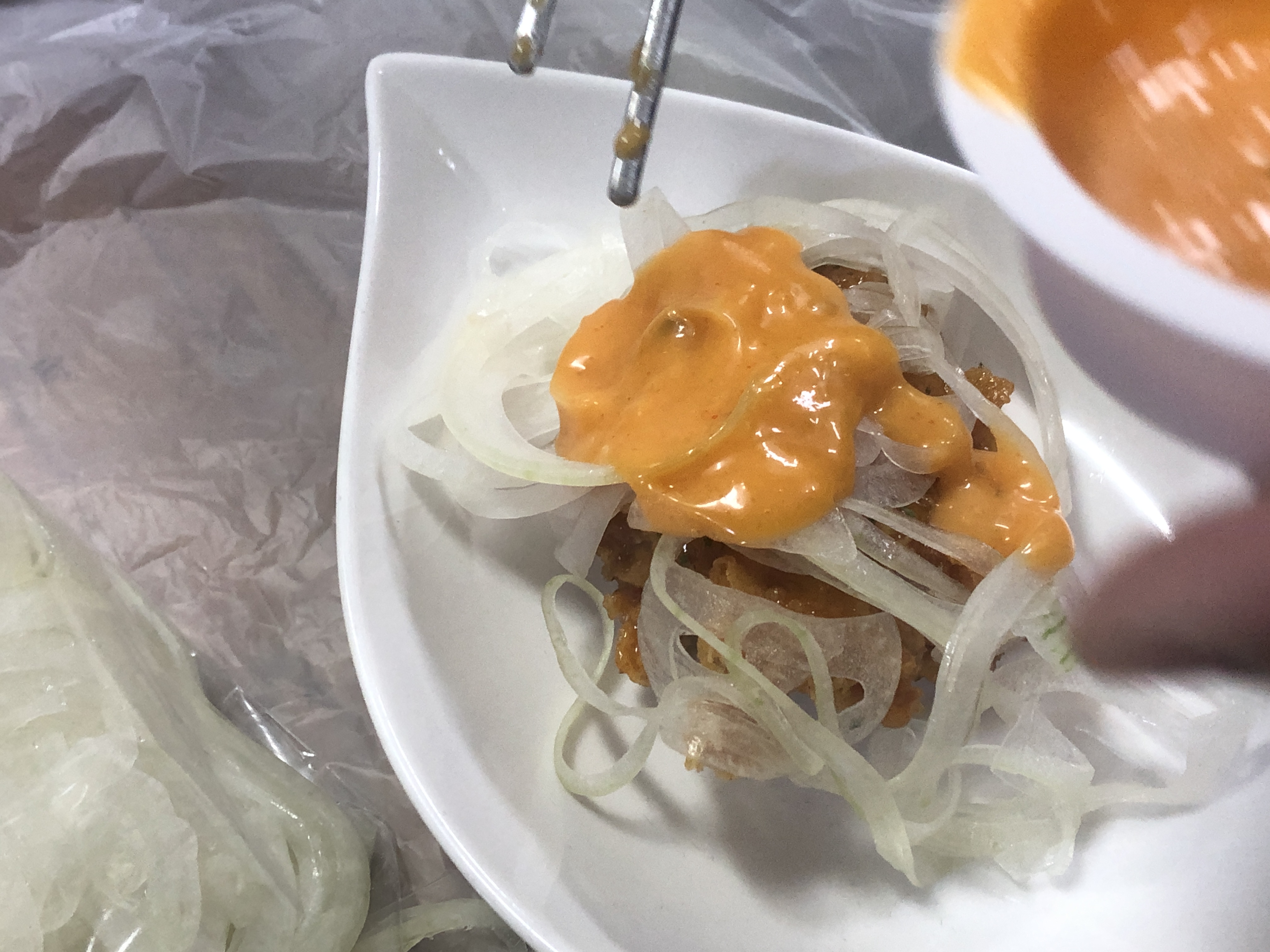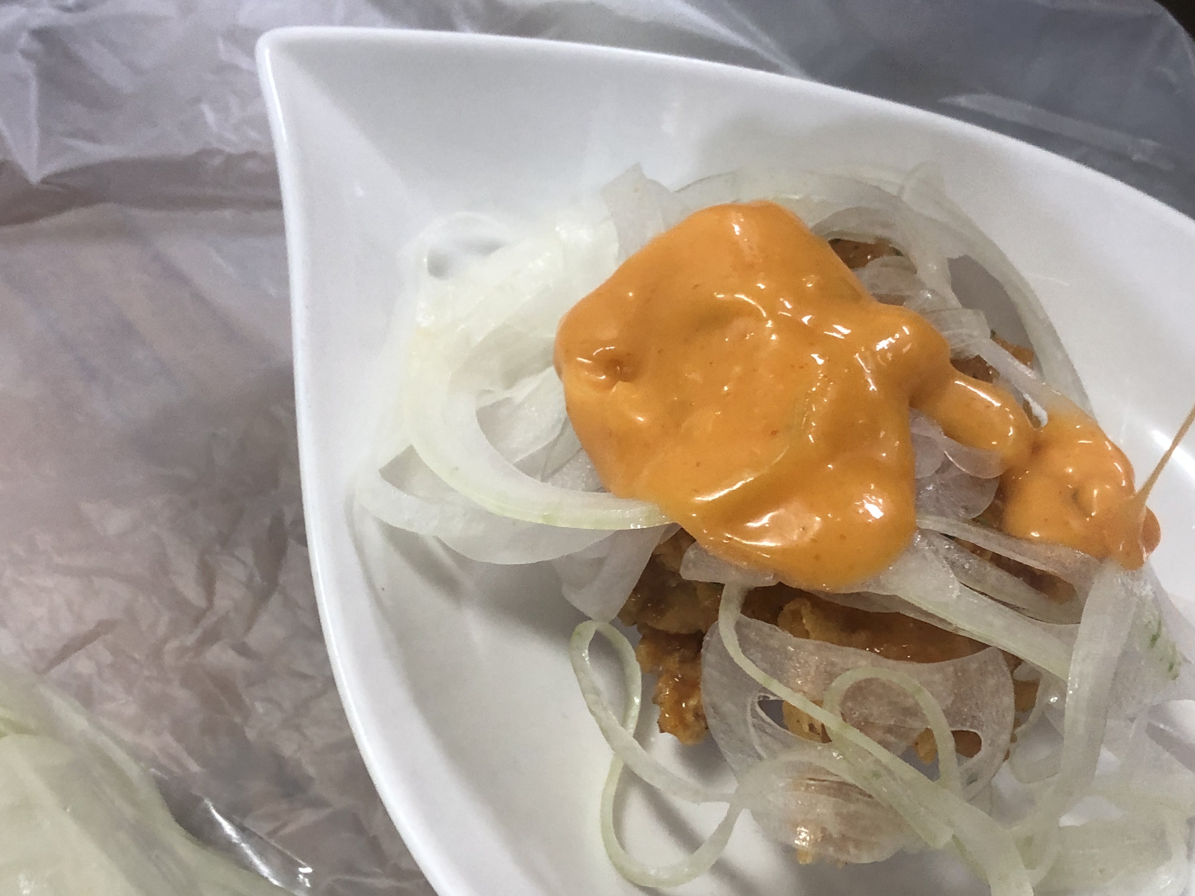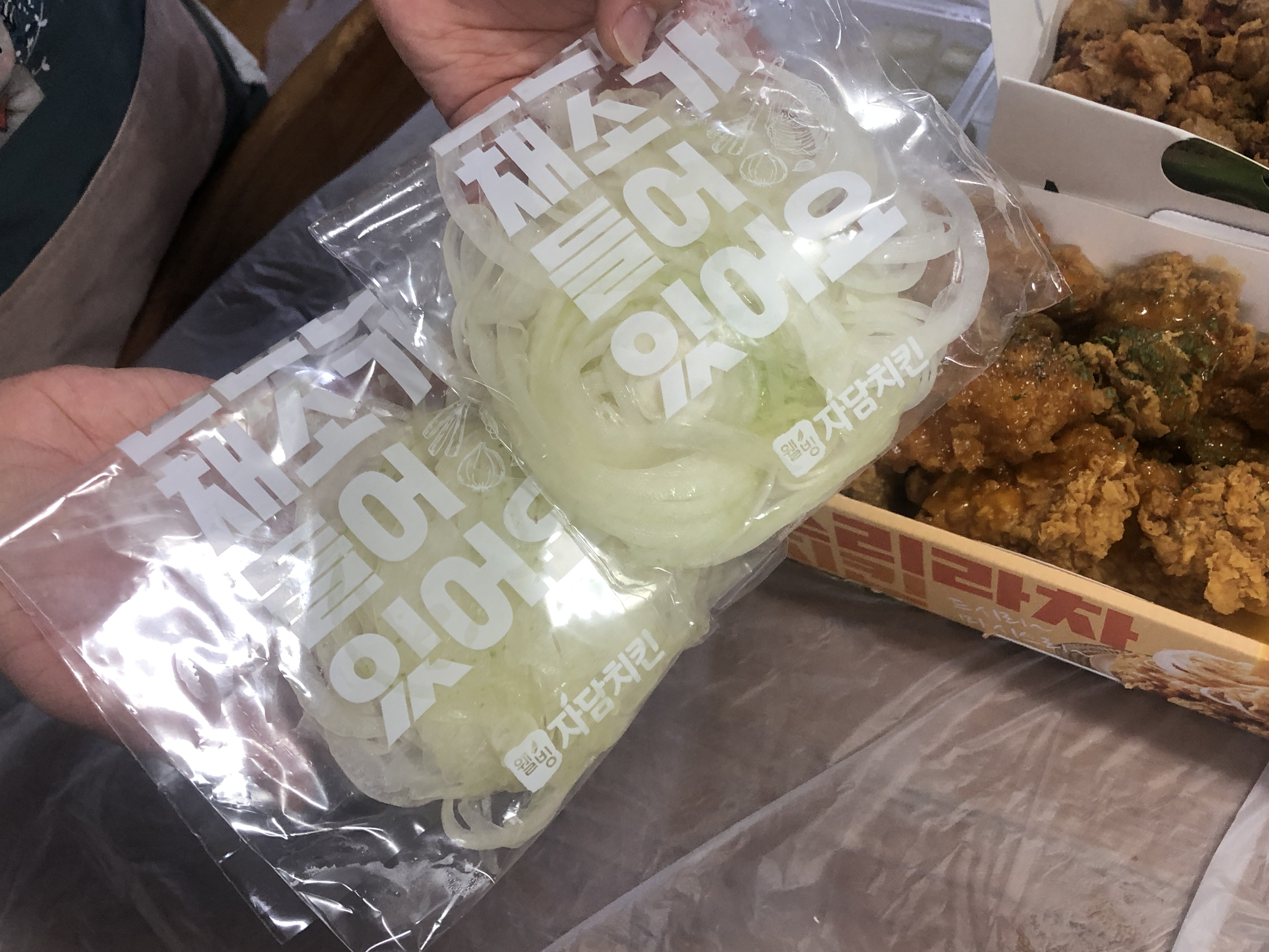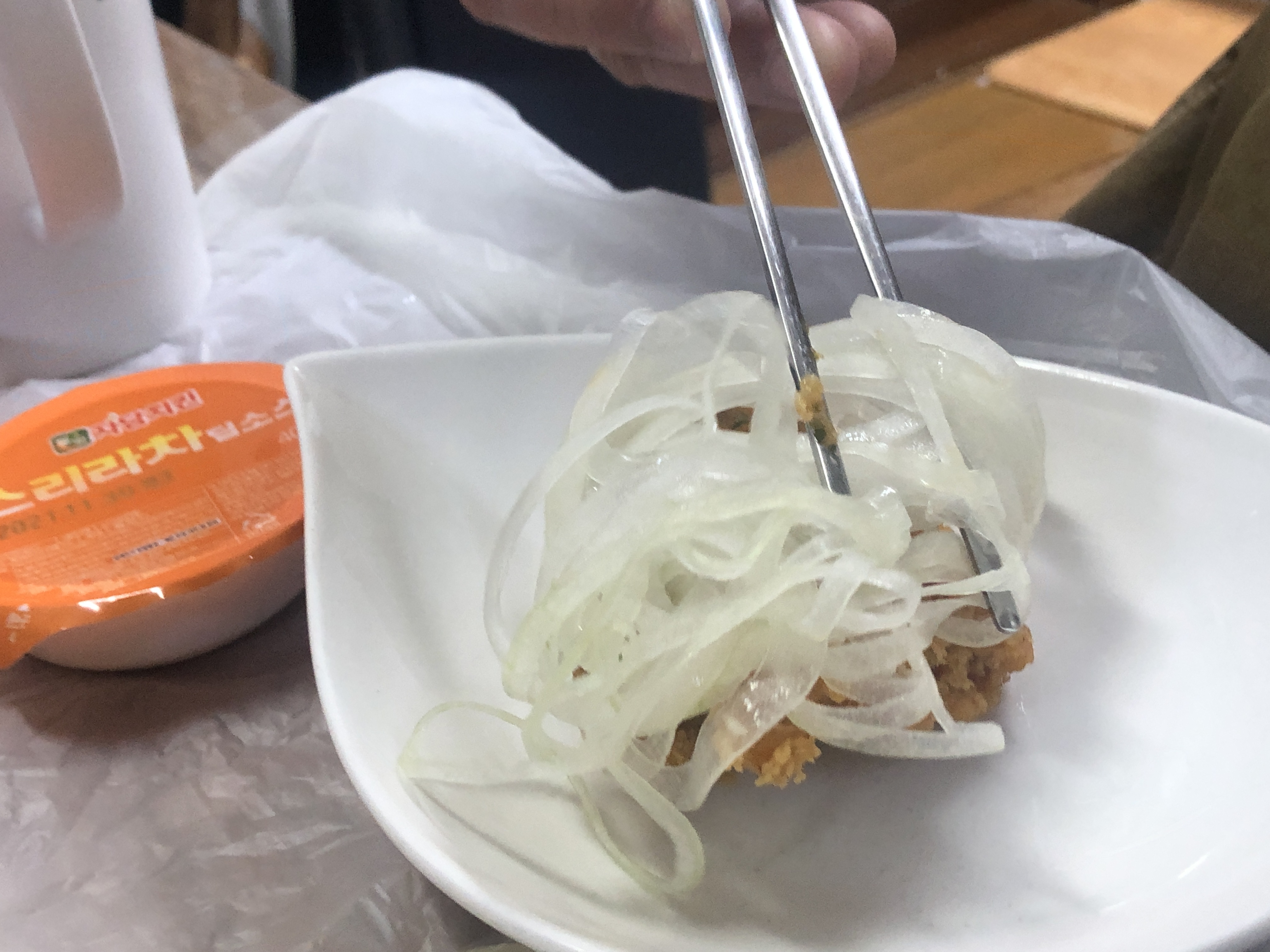 채썬 양파와 스리라차소스랑 함께 먹는 치킨이랍니다.